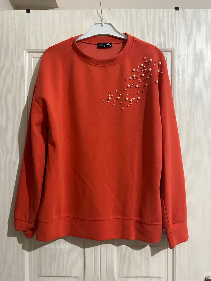 Turuncu renk bisiklet yaka 1-2 tane boncuğu düşmüştür onun dışında hiçbir defosu bulunmamaktadır Narçiçeği rengindedir