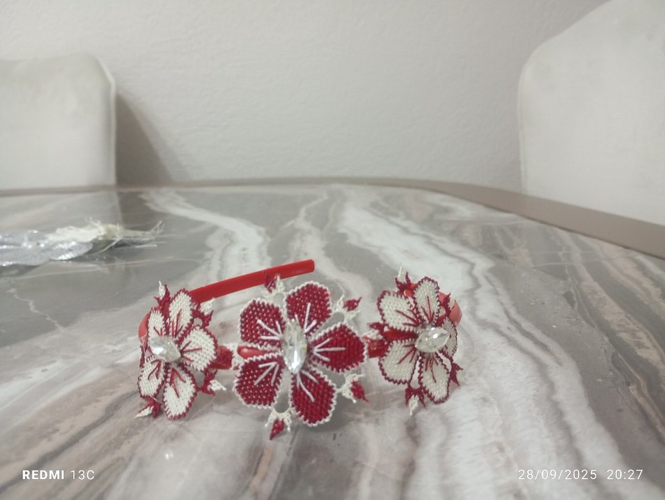 Boncuk işlemeli çiçek desenleri ve parlak taş detayları olan kırmızı örgü saç bandı, bohem tarzda.