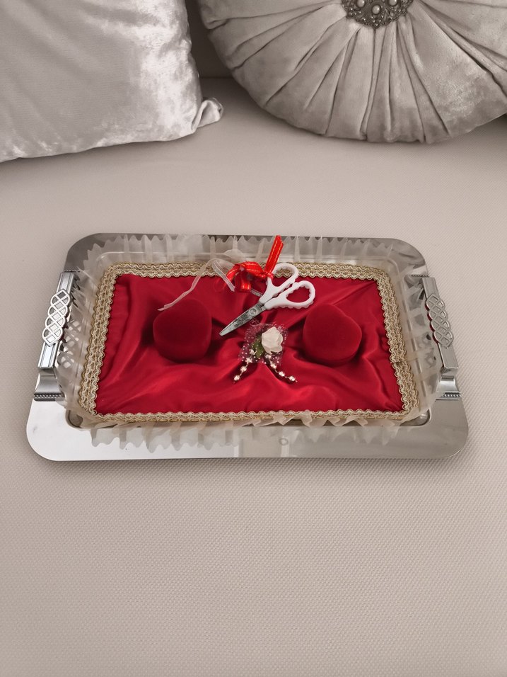 Boncuk işlemeli renkli kırmızı kadife kumaş ve süslemeli makas ile vintage tarzda düğün tepsisi. Gümüş tonlu taban üzerinde halka tutucular mevcuttur.