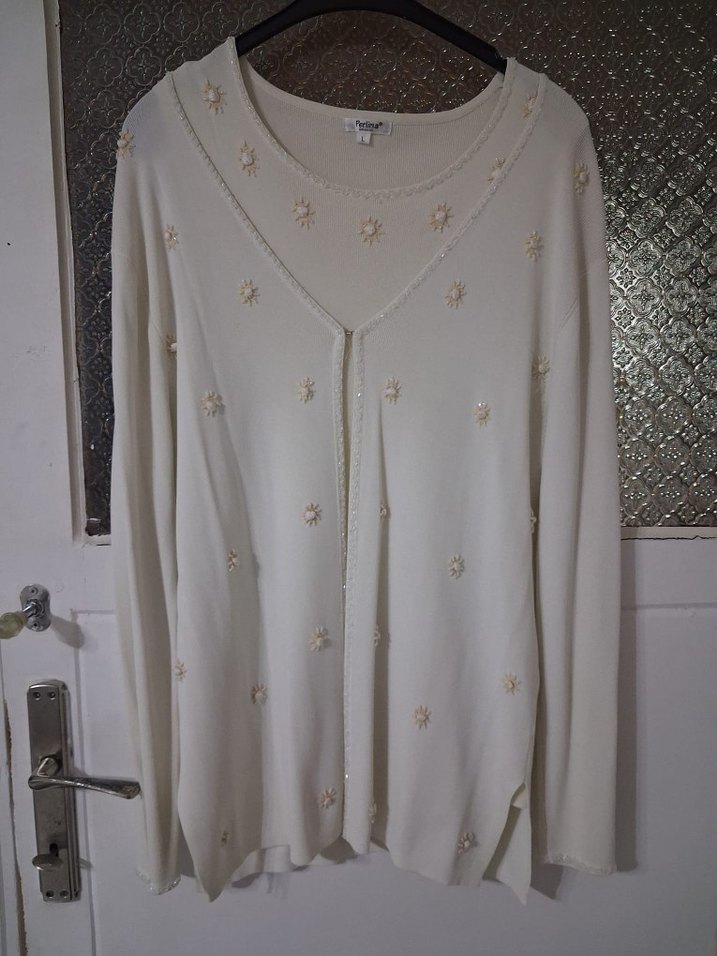 ikili, yuvarlak yaka, bol kesim beyaz triko bluz. Boncuk işlemeli ve vintage tarzda, düğünler için uygun.