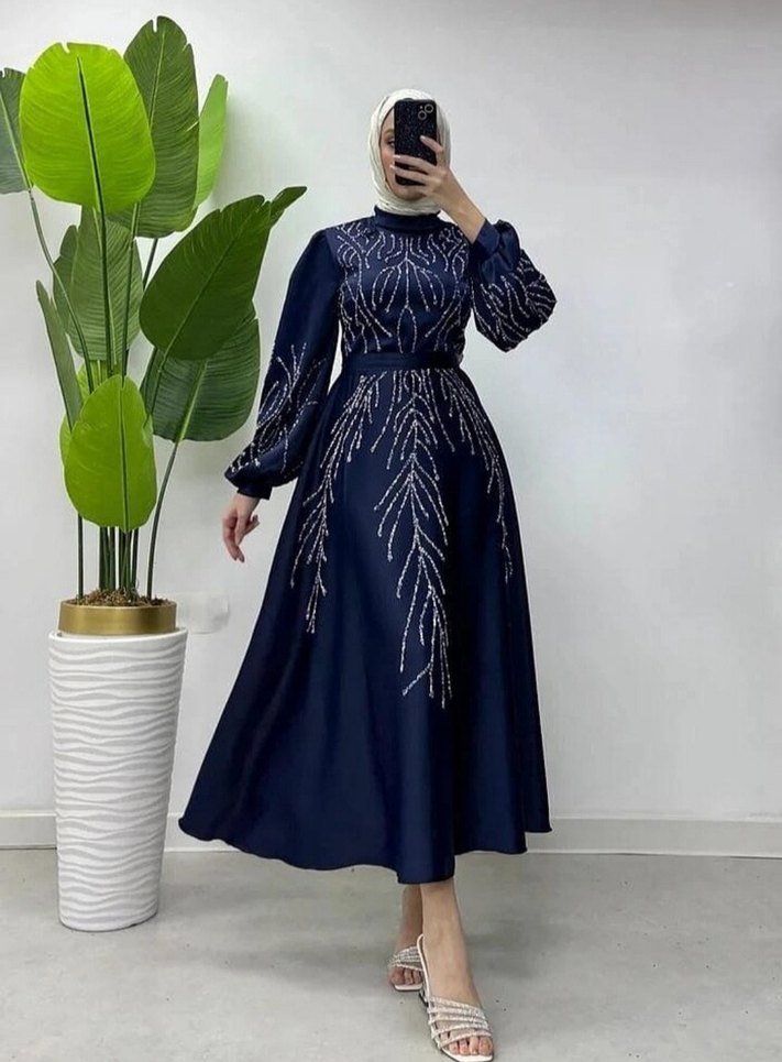 Boncuk İşlemeli Lacivert Abiye Elbise
