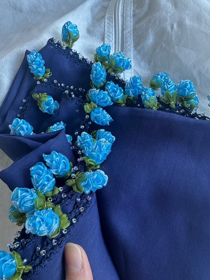 Lacivert kadın fular, boncuk işlemeli kenarları ve mavi çiçek detaylarıyla bohem tarzda, yumuşak tekstil malzemeden yapılmıştır.