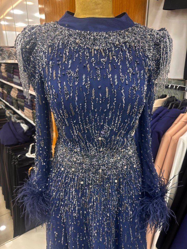 Boncuk İşlemeli Lacivert kenzel Uzun Abiye Elbise