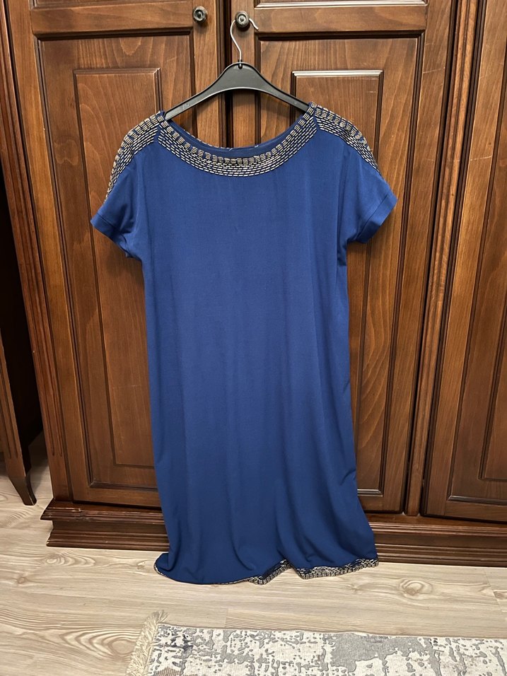 Lacivert renkte, kısa kollu, yuvarlak yakalı ve bol kesim midi elbisedir. Omuz ve yaka kısmında parlak boncuk işlemeleri bulunur, romantik akşamlar için uygundur.
