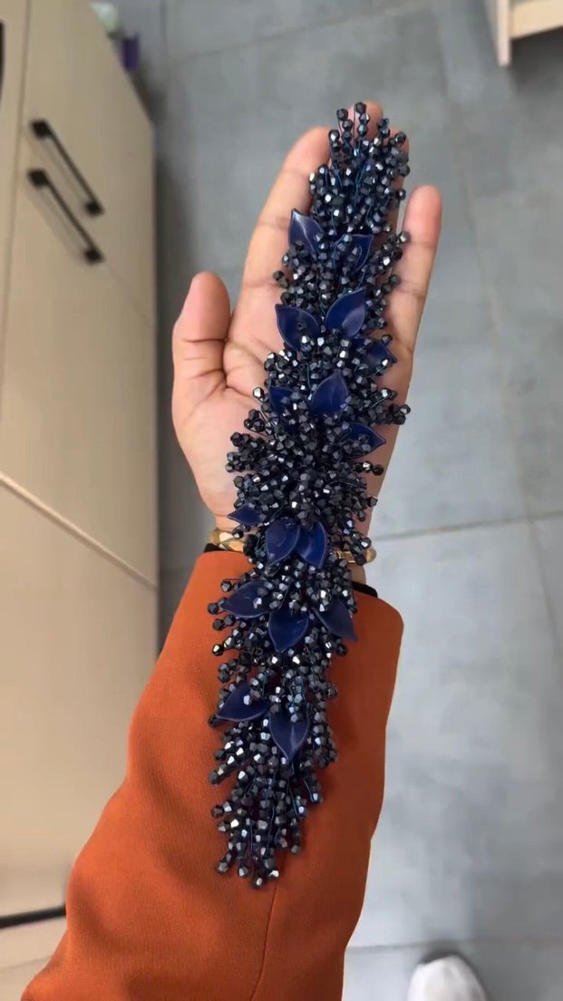 Lacivert boncuk malzemeden yapılmış, boncuk işlemeli bu saç aksesuarı, gösterişli ve bohem tarz sunar. Moda tutkunları için ideal.