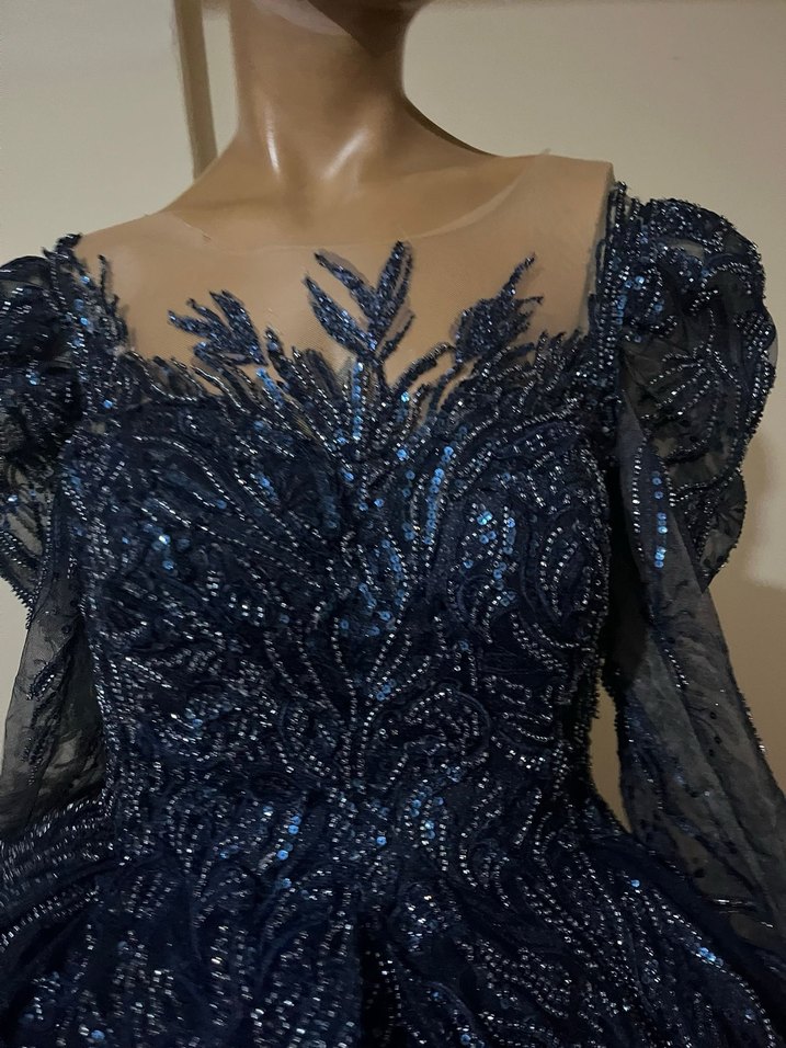 Lacivert uzun abiye elbise, boncuk işlemeli ve tekne yaka ile uzun kolludur. Düzenli kesimi ve gotik tarzıyla şık partiler için uygundur. İpi yok
