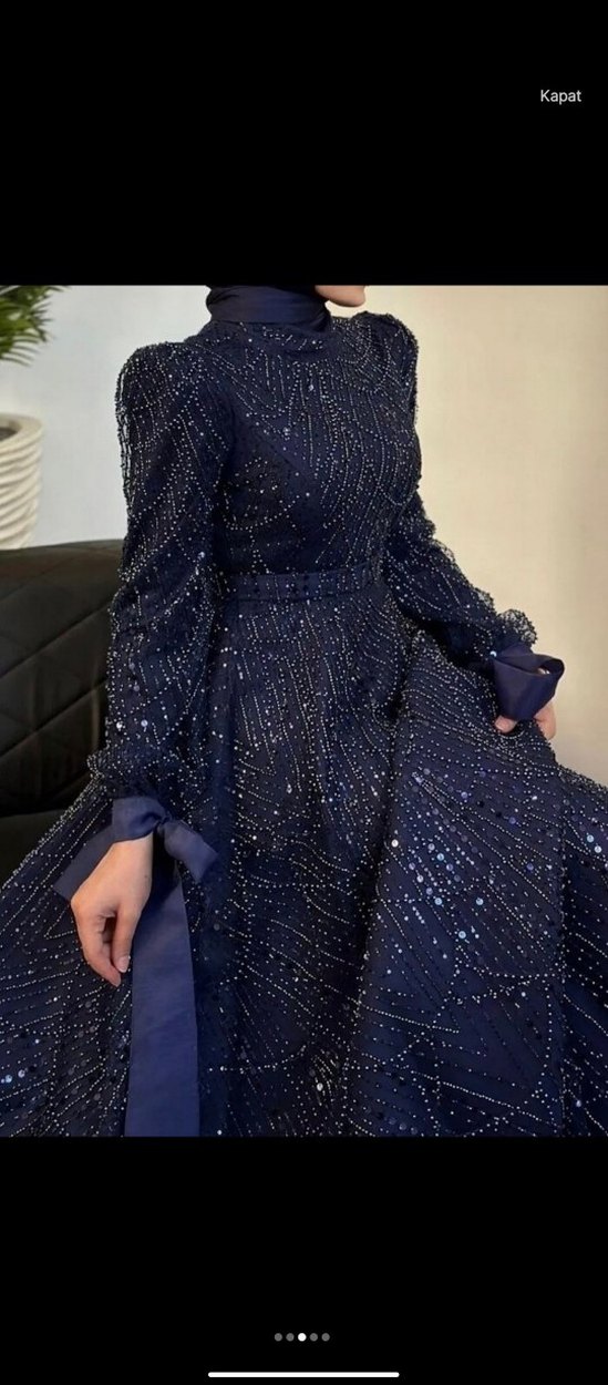Lacivert uzun abiye elbise, yüksek yakalı ve askılı kolludur. Boncuk işlemeli detayları ve regular kesimiyle düğünler için uygundur. ✨