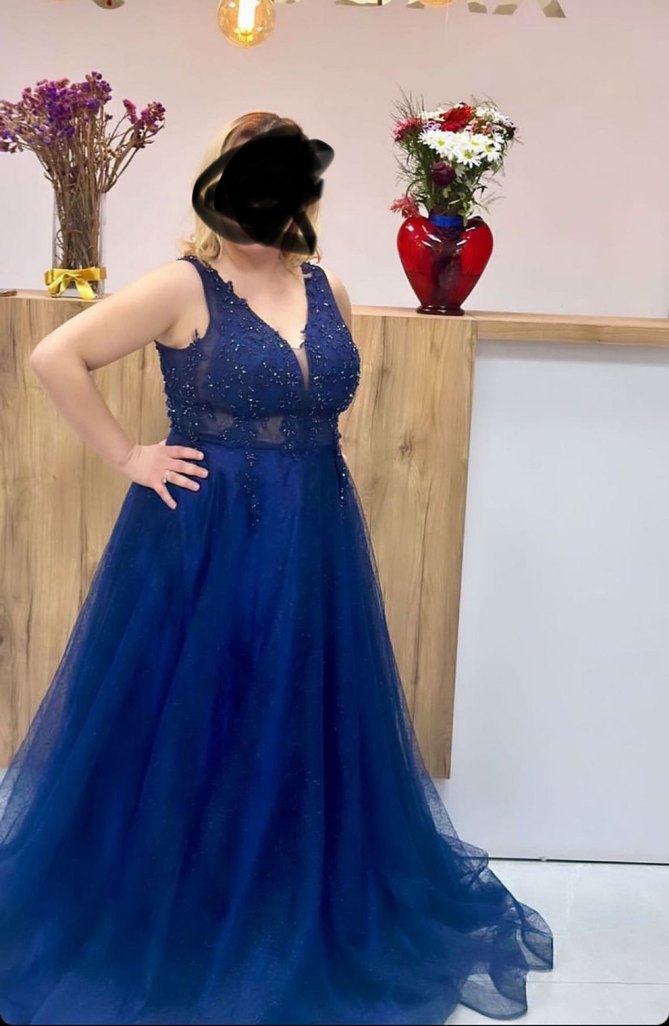 bir kez kullanıldı Boncuk işlemeli, V yaka, kolsuz ve vücuda oturan lacivert nişan elbisesi. Uzun boy ve desen içermeyen koyu renk kumaşı düğünler için uygundur.