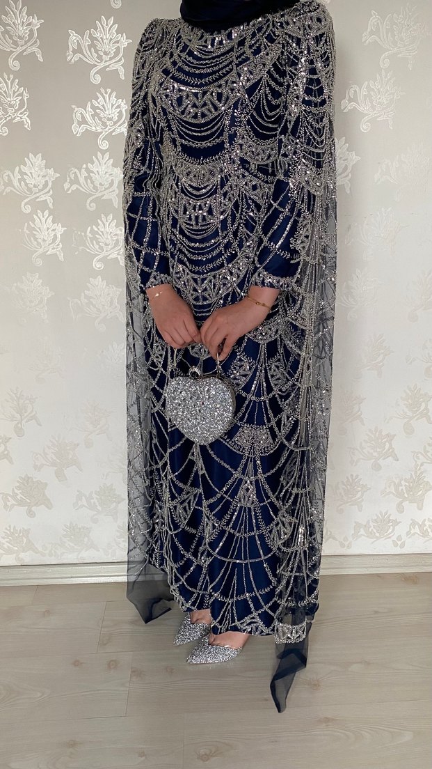 Boncuk İşlemeli Lacivert Uzun Abiye Elbise