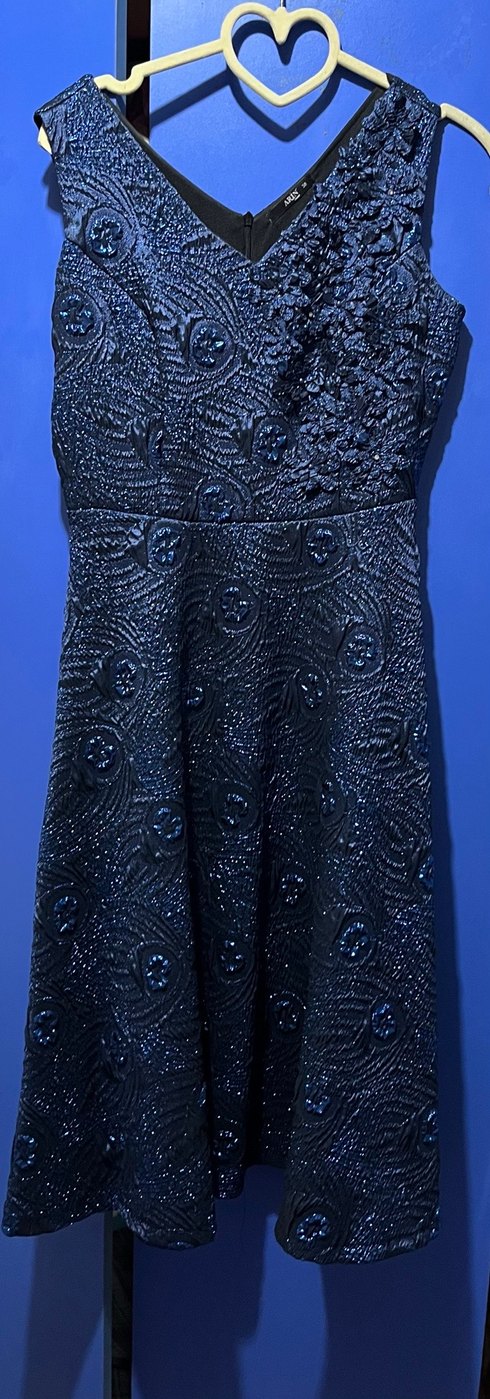Lacivert, uzun ve vücuda oturan bu abiye elbise V yakalı ve ince askılıdır. İşlemeli ve boncuk detaylarıyla gotik, avangart bir tarz sunar.