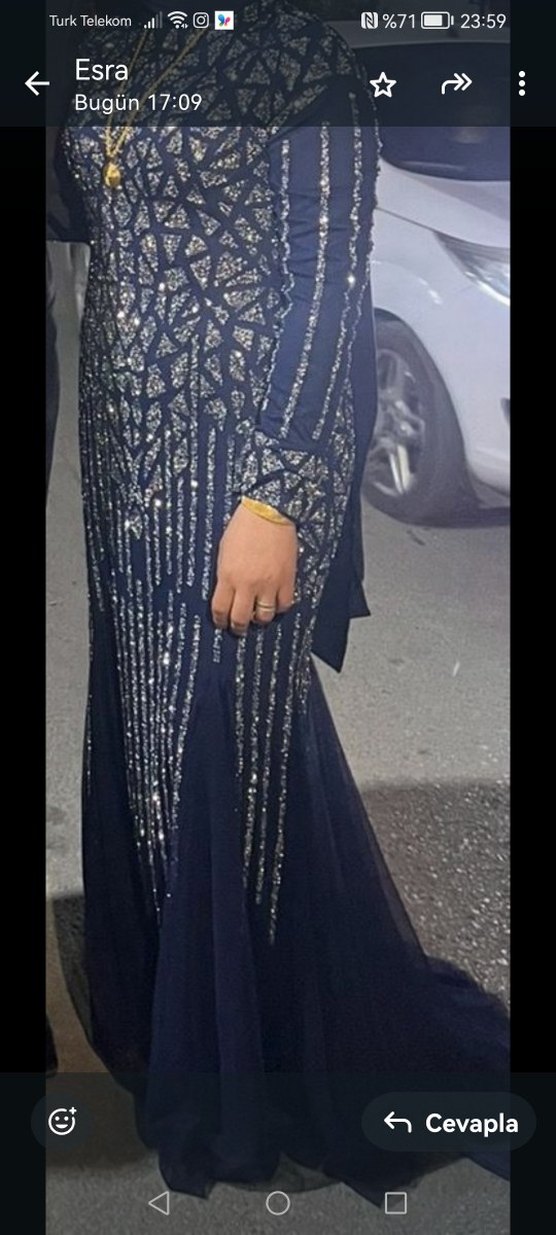 Boncuk işlemeli, desenli lacivert uzun abiye elbise. Uzun kollu ve yakası kesimli, şık ve gösterişli bir tasarım. ✨