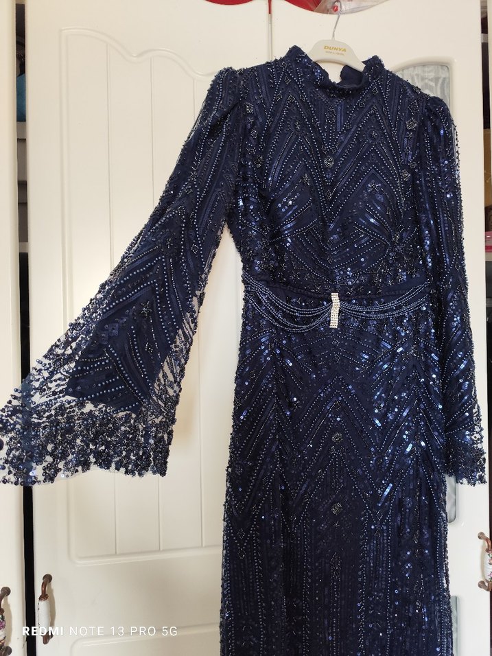 Boncuk işlemeli ve işlemeli lacivert uzun abiye elbise, uzun kollu ve yüksek yakalıdır. Bohem tarzda, düğünler için uygundur