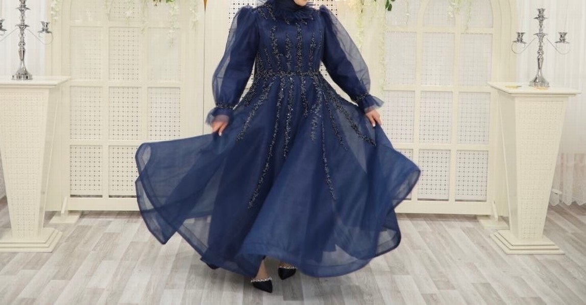 Boncuk İşlemeli Lacivert Uzun Abiye Elbise