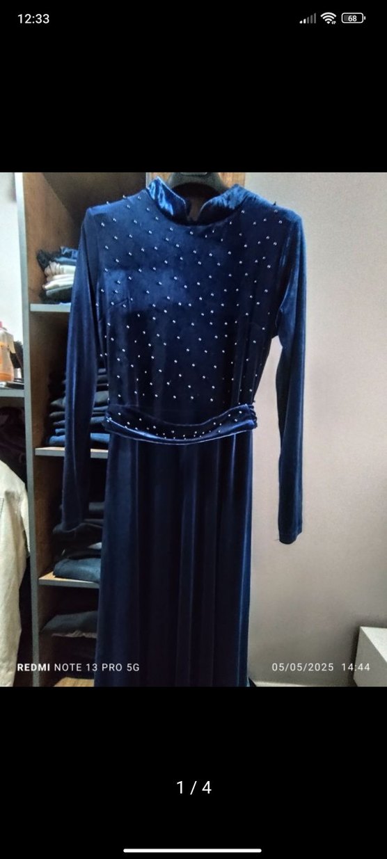 Boncuk işlemeli, uzun kollu ve yüksek yakalı bu lacivert abiye elbise, şık ve klasik bir görünüme sahiptir. Zarif detaylarla dikkat çeker.