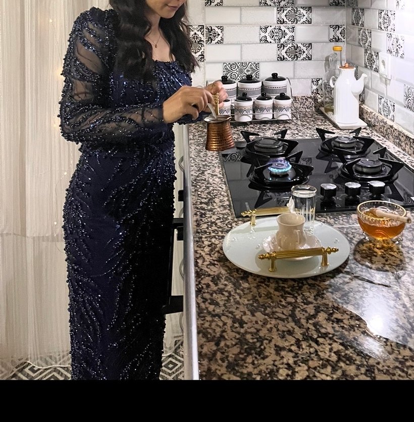 Boncuk İşlemeli Lacivert Uzun Abiye Elbise