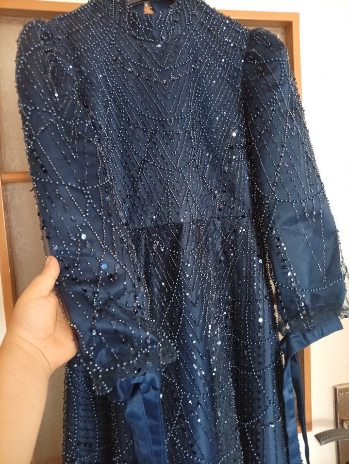 Boncuk işlemeli, işlemeli detaylarla süslenmiş, yüksek yakalı ve uzun kollu, lacivert uzun abiye elbise. Bohem tarzda, düğünler için uygun. ✨