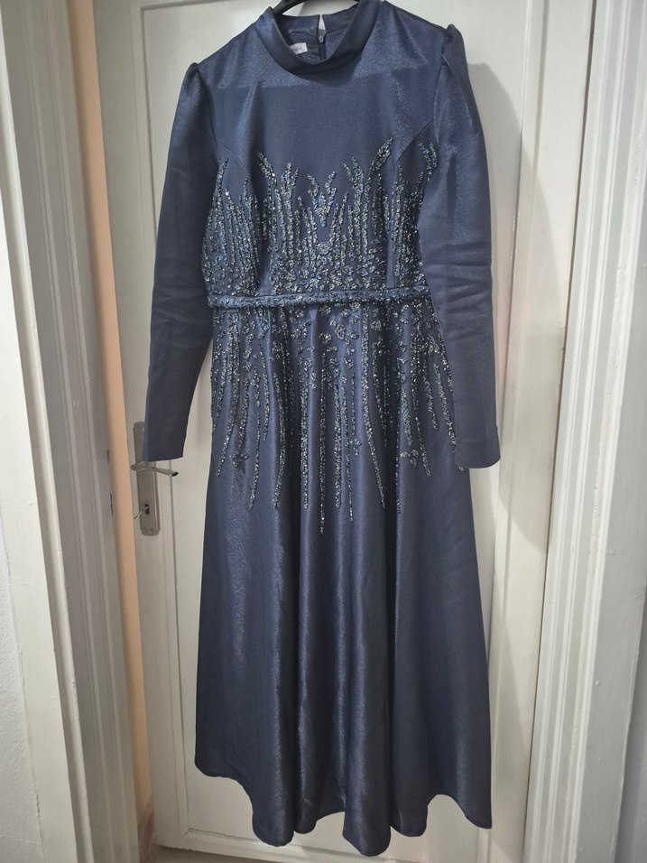 Boncuk İşlemeli Lacivert Uzun Abiye Elbise