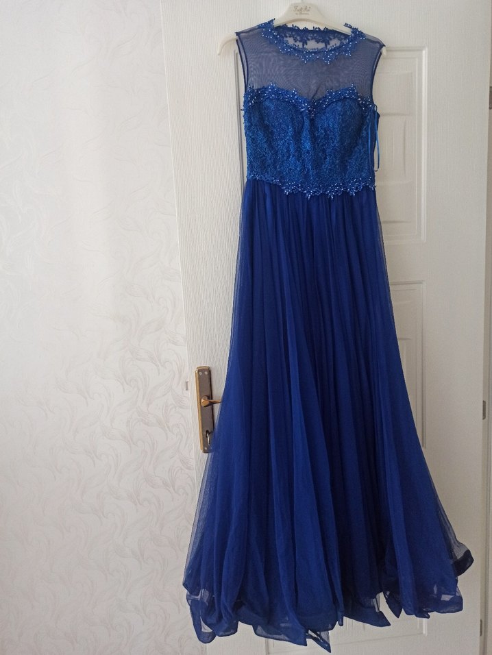 Boncuk işlemeli, transparan detaylı, fitted kesim lacivert uzun abiye elbise. Düğün ve özel davetler için uygundur.