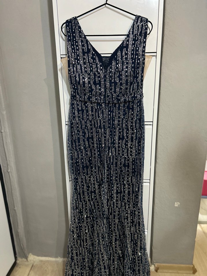 Boncuk işlemeli, V yakalı ve kolsuz, lacivert uzun abiye elbise, parti için şık bir seçimdir. ✨