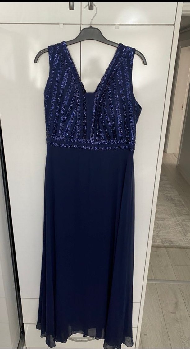 Boncuk işlemeli, V yakalı, kalın askılı lacivert uzun abiye elbise, düğünler için şık ve klasik bir seçimdir. ✨ Kızımın kınasında kullandım sıfır ayarında tertermiz sorunsuz.