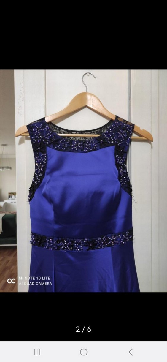 Boncuk işlemeli, lacivert renkli, uzun ve kolsuz gece elbisesi. Teknolojik parlaklıkta, baskılı ve klasik şıklıkta, düğünler için uygun.arka kısmı kuyrukludur. Ürün 1 kere giyildi.