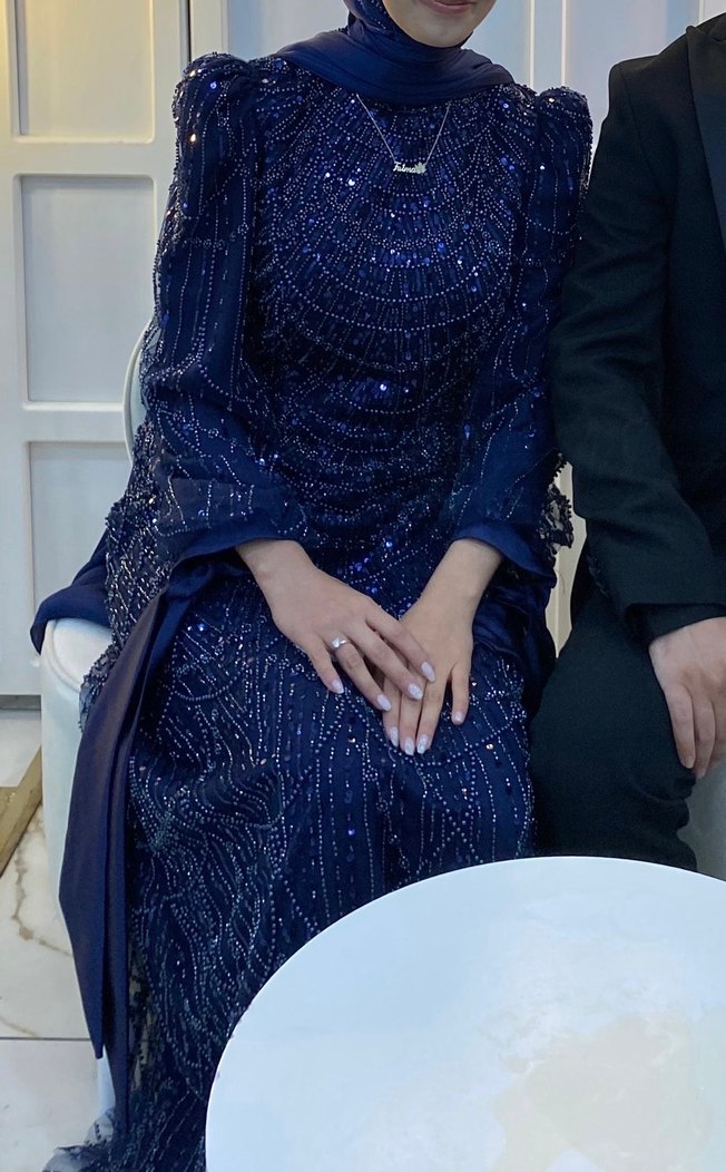Boncuk işlemeli, uzun kollu ve yüksek yakalı lacivert abiye elbise, şık ve klasik zarafet için ideal.