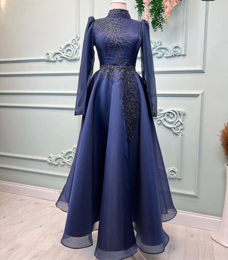 Boncuk işlemeli, işlemeli detaylara sahip lacivert uzun abiye elbise, yüksek yakalı ve uzun kolludur, modern klasik bir tarz sunar.