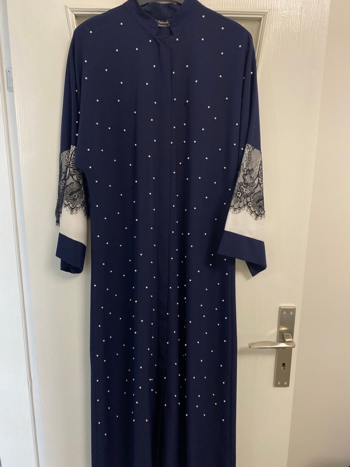 Lacivert uzun elbise, yüksek yakalı, dantel detaylı uzun kollu ve boncuk işlemelidir. Düzenli kesim ve ipeksi dokusuyla mütevazı tarz için uygundur.
