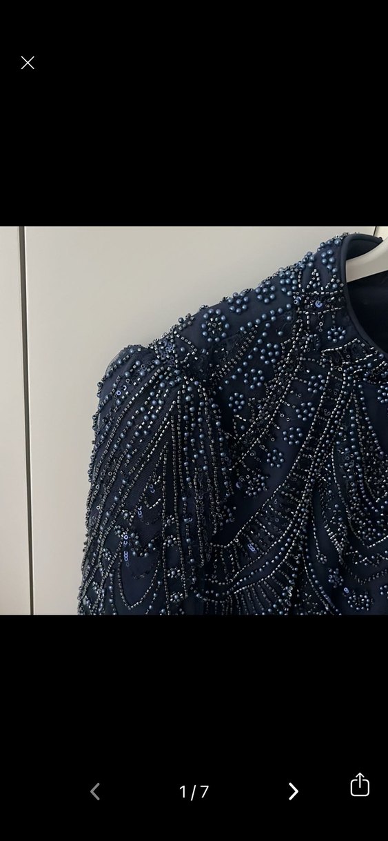 Lacivert uzun kadın elbise, dar kesim, uzun kollu ve yuvarlak yaka. Boncuk işlemeleriyle süslenmiş, gösterişli parti elbisesi. ✨