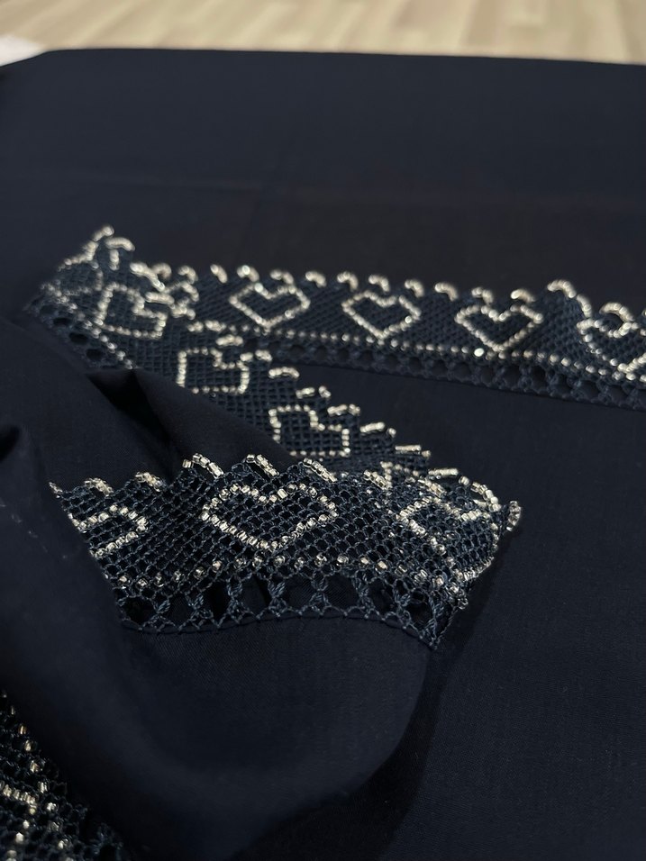 Ayrıntılı olarak bakabilirsiniz Yeni işledim daha ütü bile yapılmadı Yumuşak dokulu lacivert kadın yazma , kenarlarında boncuk işlemeleriyle sade ve gotik tarzda modest bir görünüm sunar.
