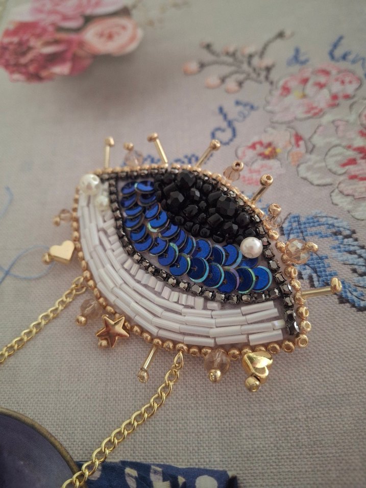 Boncuk işlemeli, mavi ve siyah pullar, inci ve altın renkli zincirlerle süslenmiş, nakışlı göz motifi şeklinde bohem tarzda broş. Günlük kullanım için uygundur.