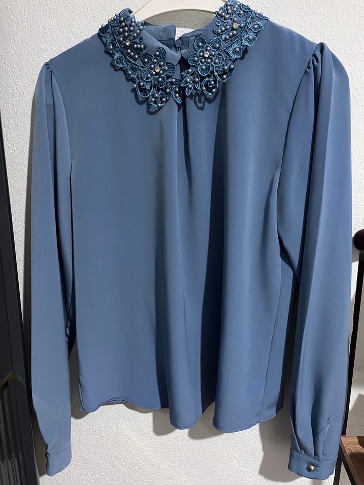 Boncuk işlemeli yakası ve uzun kollu tasarımıyla mavi kadın gömleği, modern klasik tarzda ✨ 1 kez giyildi
