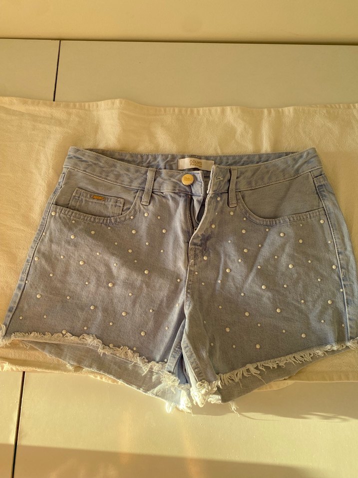 Boncuk işlemeli, işlemeli desenli, bol kesim mavi denim mini şort, yıpranmış kenar detaylarıyla günlük sokak stili için uygun.