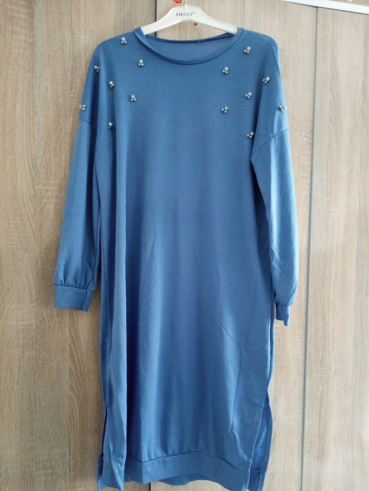 Boncuk işlemeli nakış detaylı, uzun kollu, bol kesim mavi tunik. Yumuşak sentetik kumaştan, günlük kullanım için uygundur.
