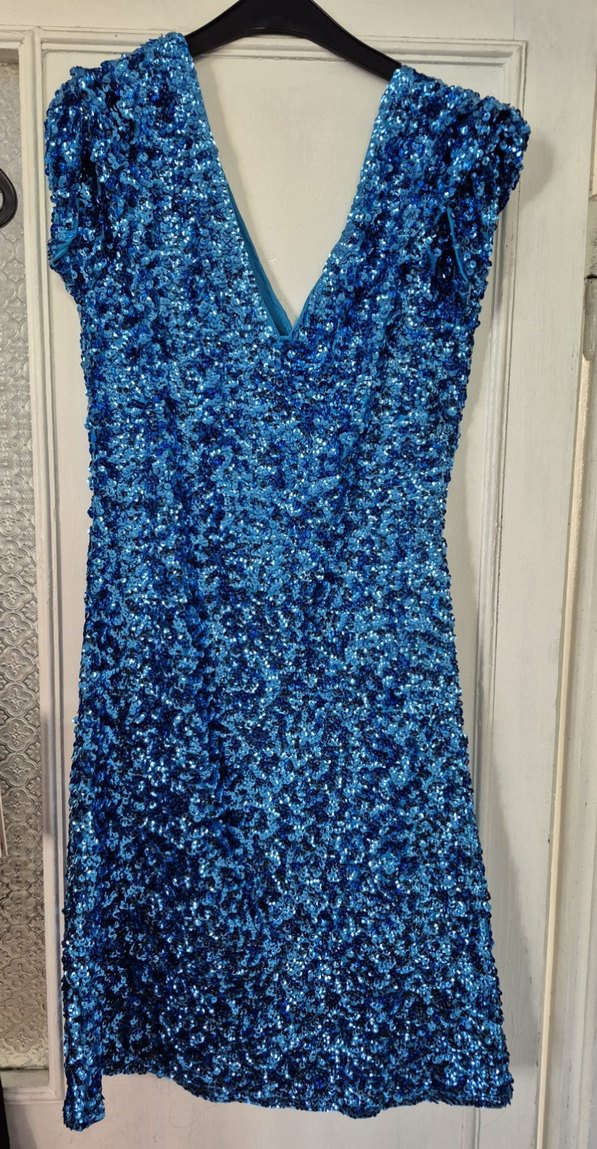 Boncuk işlemeli, kolsuz ve V yakalı bu uzun abiye elbise, parlak mavi tie-dye deseniyle dikkat çeker. ✨