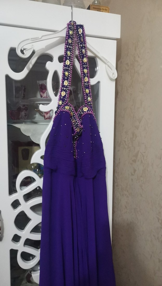 Boncuk İşlemeli Mor Uzun Abiye Elbise