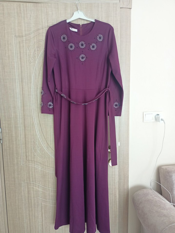 Boncuk işlemeli, uzun kollu, yuvarlak yaka mor elbise. Sentetik kumaştan, düzenli kesim ve sade tarzda, düğün için uygun.
