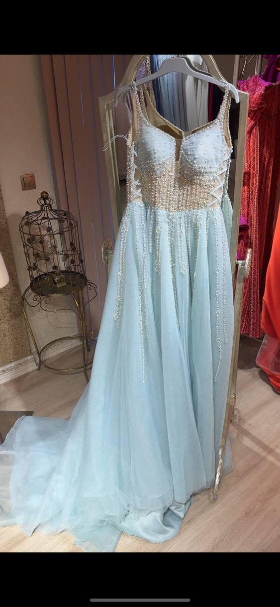 Sıvama Boncuk işlemeli, ince askılı, mavi uzun nişan elbisesi. Göğüs ve bel kenarları hayalet tülle kaplanmıştır ten göstermez. Sıfır üründür özel dikim. 34/38 beden uyumlu. TA-rih sorun