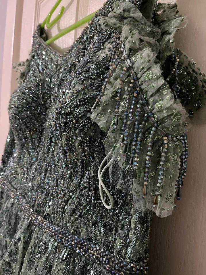 Uzun, yeşil ve dar kesimli bu elbise, tekne yaka ve askılı kollara sahiptir. Boncuk işlemeli ve nakışlıdır, partiler için bohem ve avangard tarz sunar.