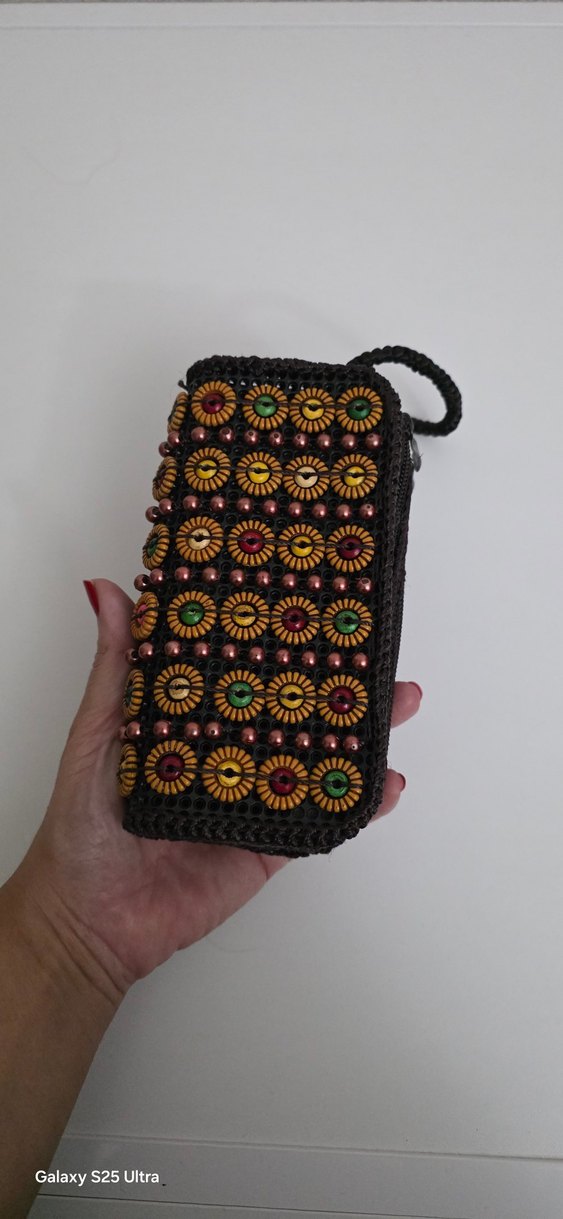 Boncuk işlemeli, işlemeli desenlere sahip koyu renkli çok renkli örgü bohem tarzı kadın el çantası, günlük kullanım için uygun.