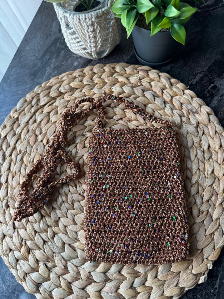 Boncuk işlemeli renkli detaylara sahip kahverengi örgü çapraz çanta, bohem tarzı yansıtır ve günlük kullanım için uygundur. Elişi sıfır ürün