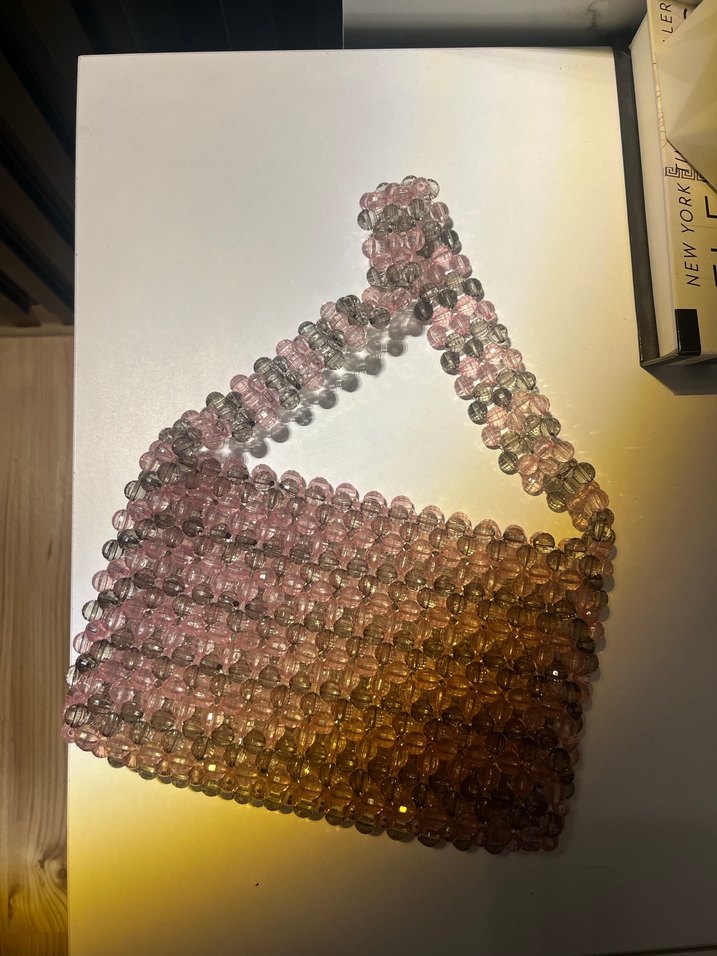 Boncuk işlemeli, pastel renklerde cam boncuklardan oluşan bağlama desenli kadın çanta. Bohem ve minimal tarzı bir araya getirir, günlük kullanıma uygundur.