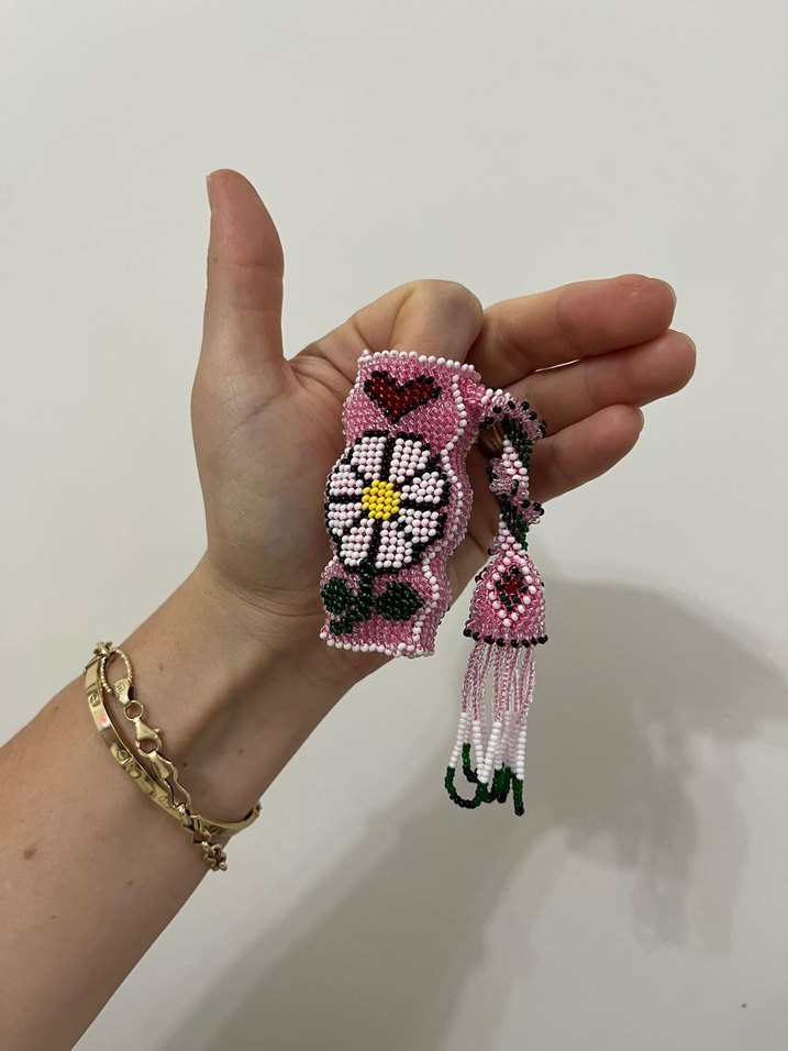 Pembe boncuk işlemeli, çiçek ve kalp desenli kadın el zinciri, bohem ve retro tarzlar için renkli ve şık bir aksesuar.