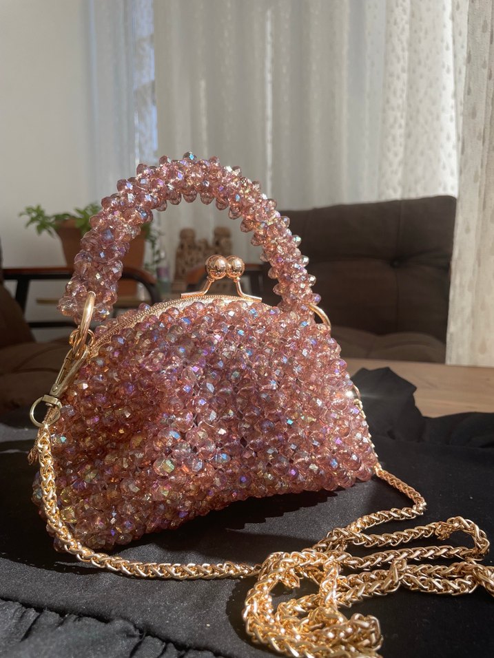 Pembe örgü kumaştan, boncuk işlemeli, altın zincir askılı, bohem ve gösterişli tarzda kadın çantası, düğünler için uygun.