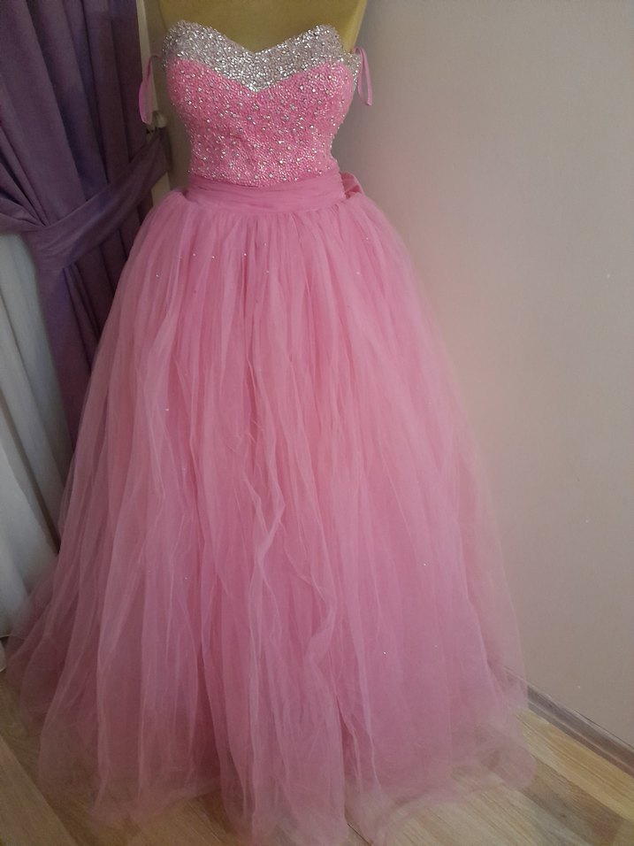 Boncuk işlemeli, pembe straplez uzun abiye elbise, düğün ve özel günler için şık ve zarif bir seçimdir.
