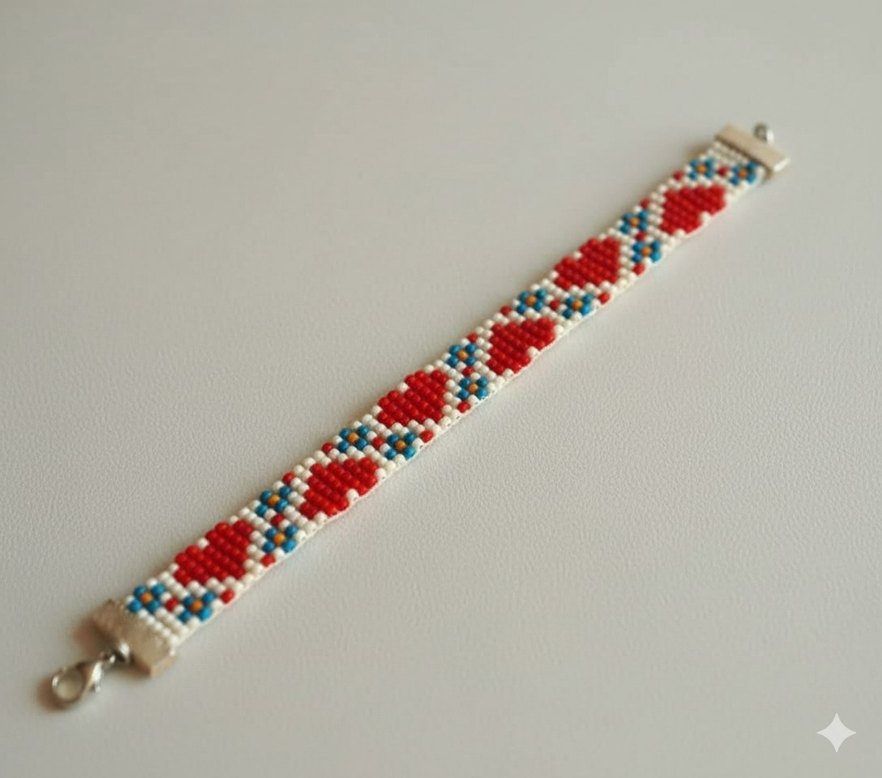 Kırmızı kalp ve mavi boncuk detaylı işlemeli desenlere sahip, renkli ve bohem tarzda günlük kullanıma uygun kadın bileklik.