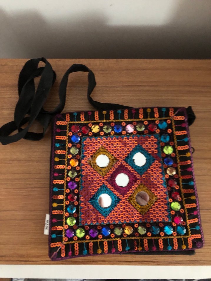 Boncuk işlemeli, renkli nakışlı tekstil malzemeden yapılmış kadın çapraz çanta. Bohem tarzını yansıtır, günlük kullanım için uygundur. Sıfır ürün
