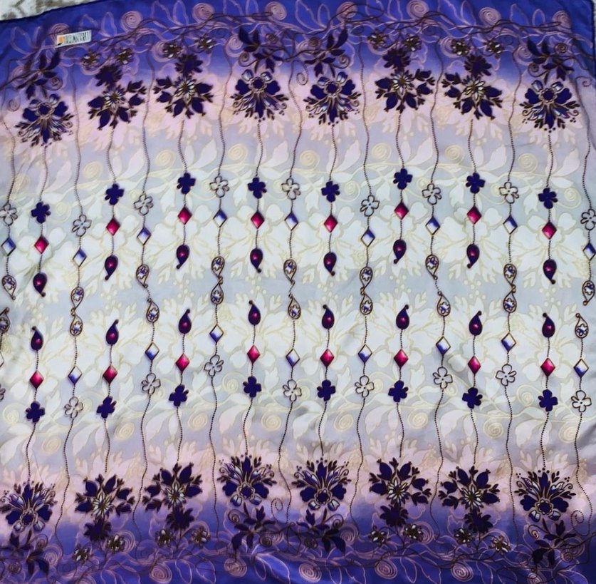 Sentetik kumaştan yapılmış, boncuk işlemeli ve renkli desenlere sahip bohem tarzda kadın fuları. İpektir