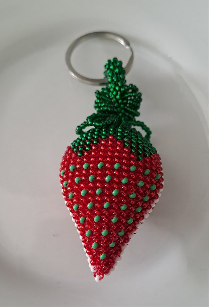 Yeşil ve kırmızı boncuklarla işlenmiş, çilek şeklinde renkli anahtarlık.halka detaylı, bohem tarzına uygun.