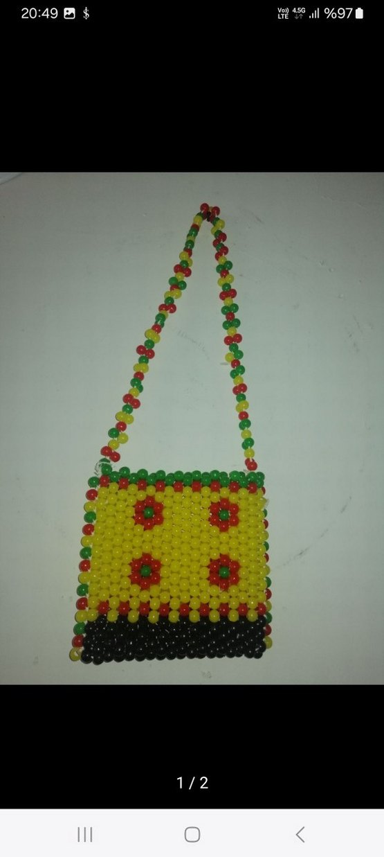 Renkli plastik boncuklardan yapılmış, işlemeli desenli kadın çantasıdır. Günlük kullanıma uygun, konvansiyonel tarzdadır. Ben duvar süsü olarak kullandim
